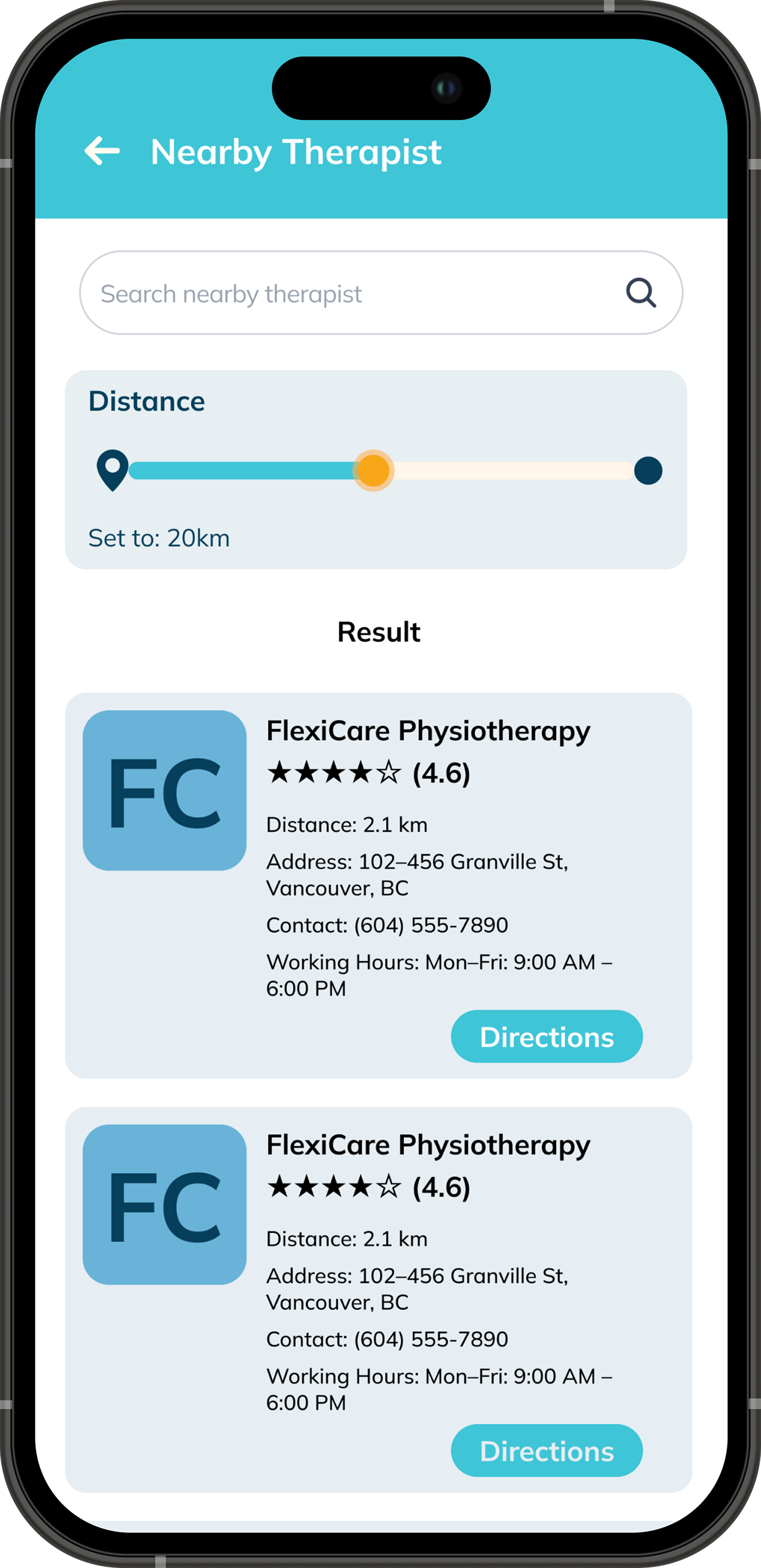 Need in-person care? Easily find nearby physiotherapy clinics with contact details and directions right from the app. For instant support, our built-in AI assistant is available 24/7 to answer your questions, offer recovery advice, or suggest exercises based on your condition so you're never without guidance, even when a real therapist isn’t around.